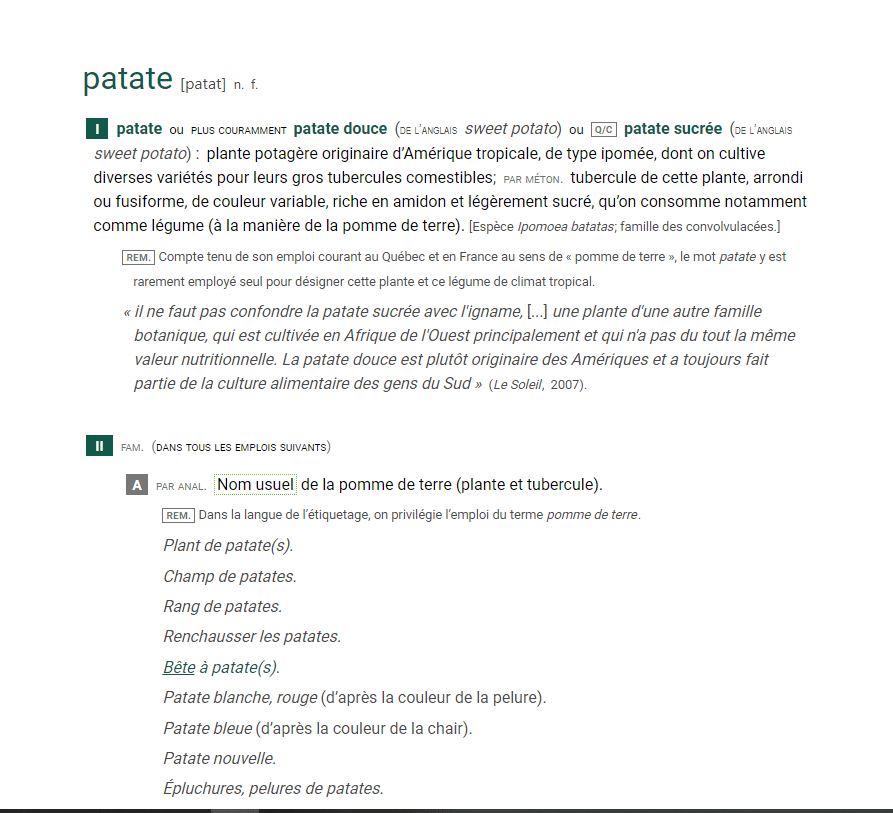 [38] « Patate », Usito, consulté le 12 avril 2024, https://usito.usherbrooke.ca/définitions/patate.