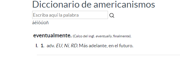 [26] « Eventualmente », Diccionario de americanismos, Asociación de Academias de la Lengua Española (ASALE), consulté le 9 avril 2024, https://www.asale.org/damer/eventualmente.